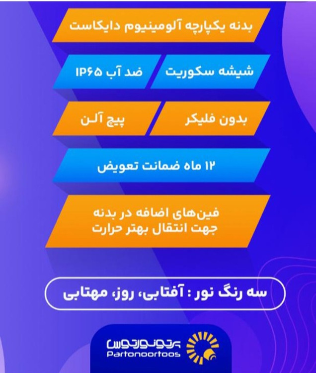 ضمانت 12 ماه _ درجه حفاظت ( IPXX) IP65_ نحوه نصب Outdoor _توان (وات) 150_ ولتاژ 230V جریان(میلی آمپر) 480_ پاور فکتور PF> 0.9_ سیم ارت دارد_ منبع نور LED SMD _درایور DOB _رنگ نور آفتابی، سفید، سفید آفتابی(یخی)-سفارشی شار نوری ( لومن ) 9600 دمای نور (کلوین) 3000-4000-6500 شاخص نمود رنگ Ra>80 زاویه پخش نور ( درجه ) 100 فلیکر دارد
